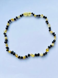 Naszyjnik bursztynowy dla dzieci ząbkowanie – jasno czarny barok gryzak